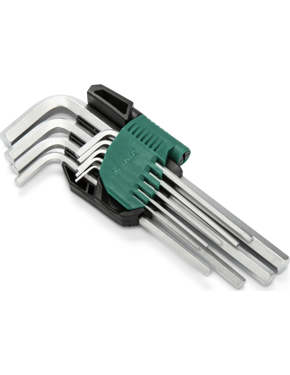 Šešiakampiai raktai, esantys smūgiams atspariame nailono pluošto dėkle su greitu rakto išėmimu