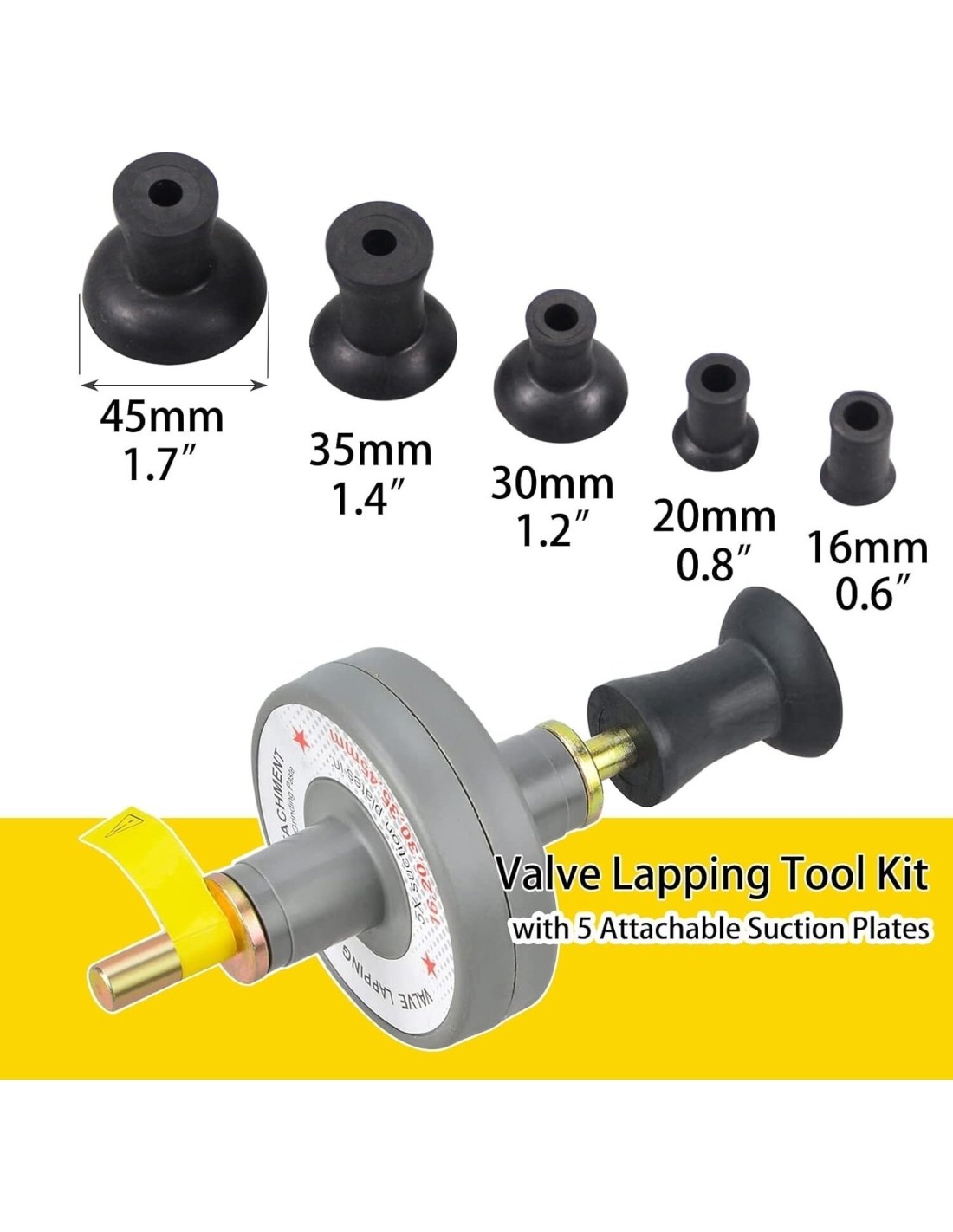 Clean all carbon deposits off valve and valve guide; Use a thin layer of engine valve lapping compound (not included) around the valve and install the valve in valve guide, Press correct size valve suction cup tool firmly onto head of valve, and use your power drill to slowly spin (1200rpm) the small lapping tool until a suitable finish is obtained