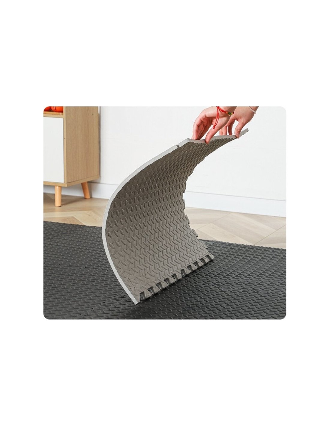 The set includes six matts with dimensions of 600x600mm and a thickness of 10mm. Each mat has two edge finishes, which allows for free arrangement