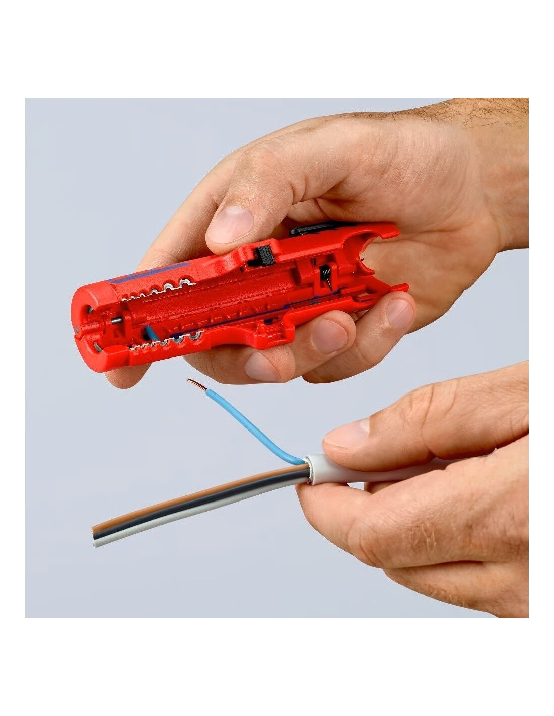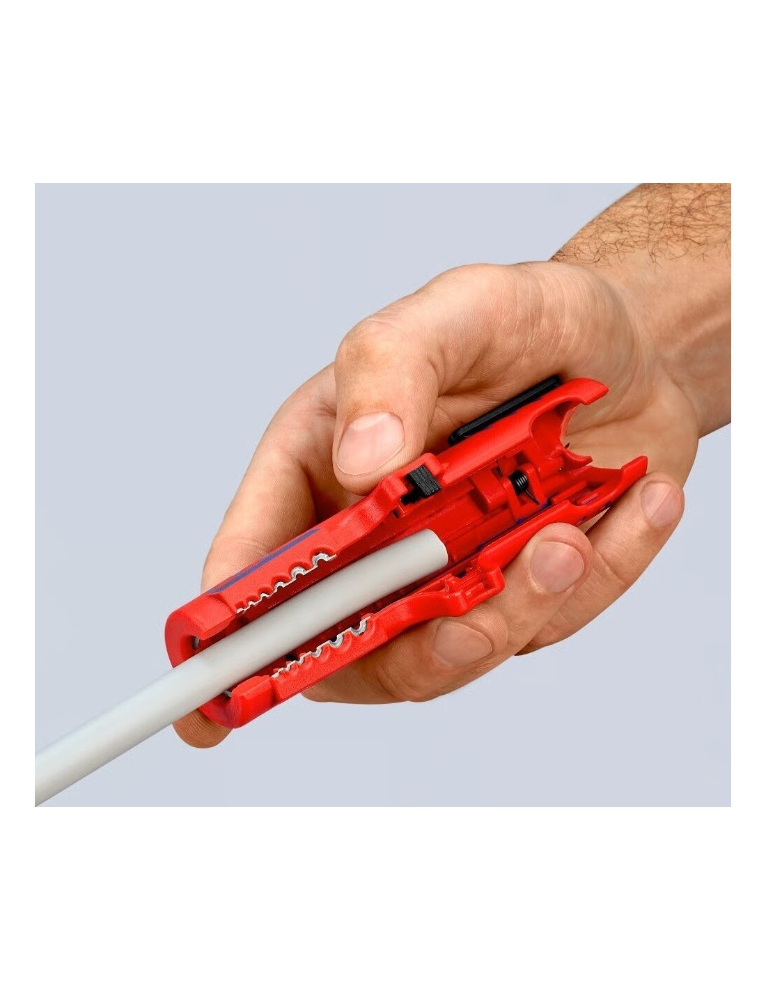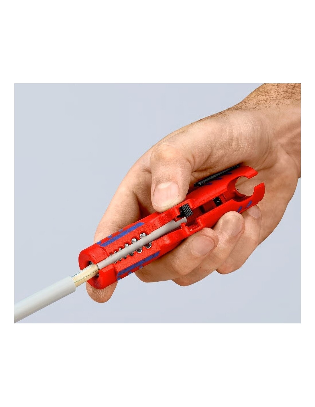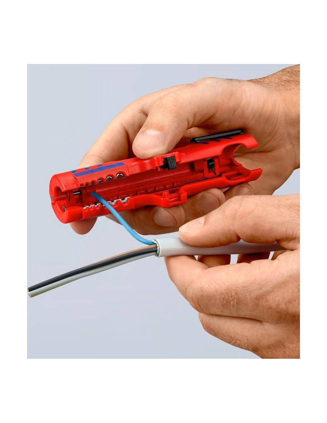 Su integruotu kabelio kreipikliu išilginiam pjovimui. Tai leidžia lengviau nuimti standžią izoliaciją (pvz., be halogenų).
