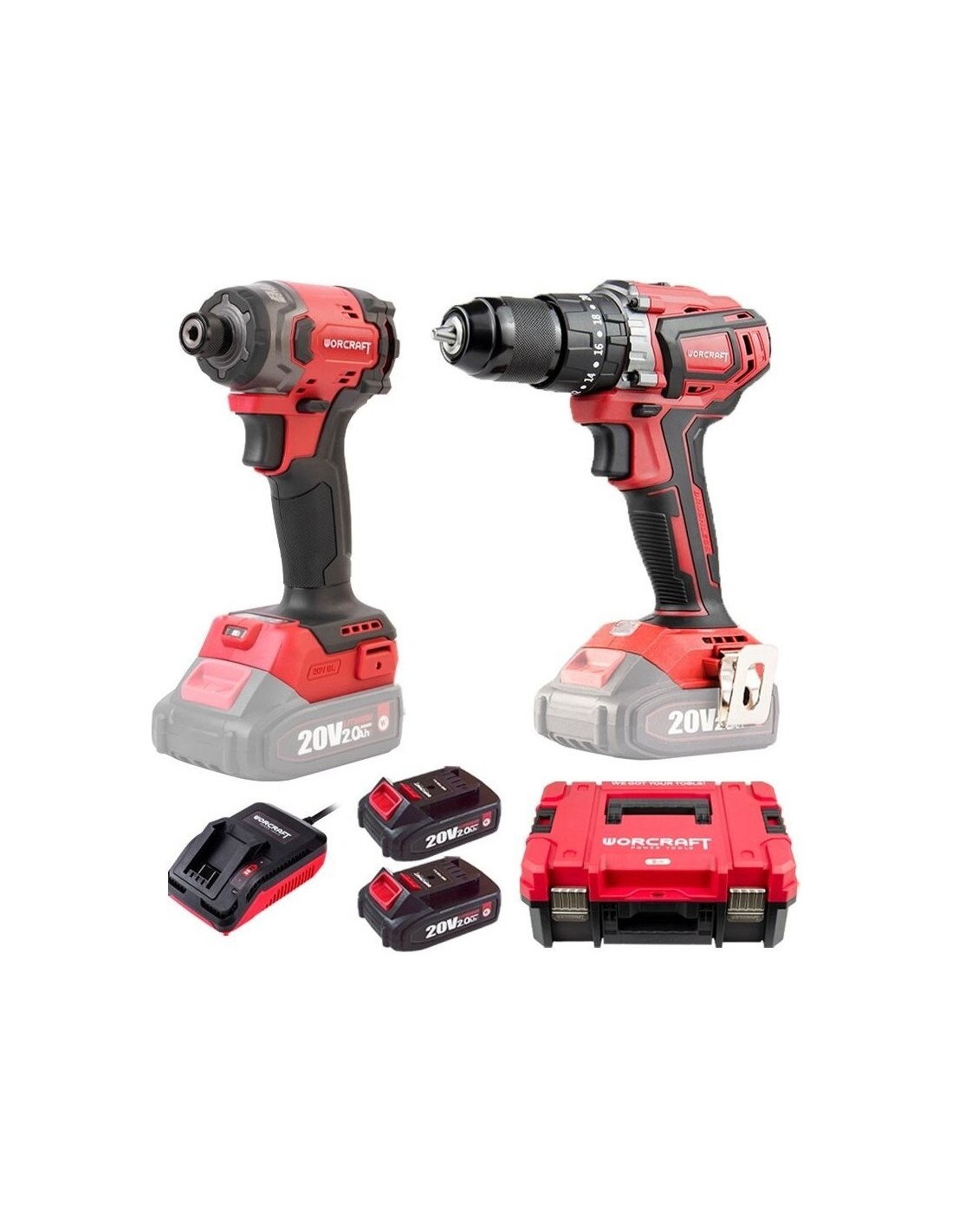 Į komplektą taip pat įeina 2 x 2.0 Ah akumuliatoriai CLB-20V-2.0H iš ONE FOR ALL linijos ir CLC-20V-2.4HB įkroviklis.