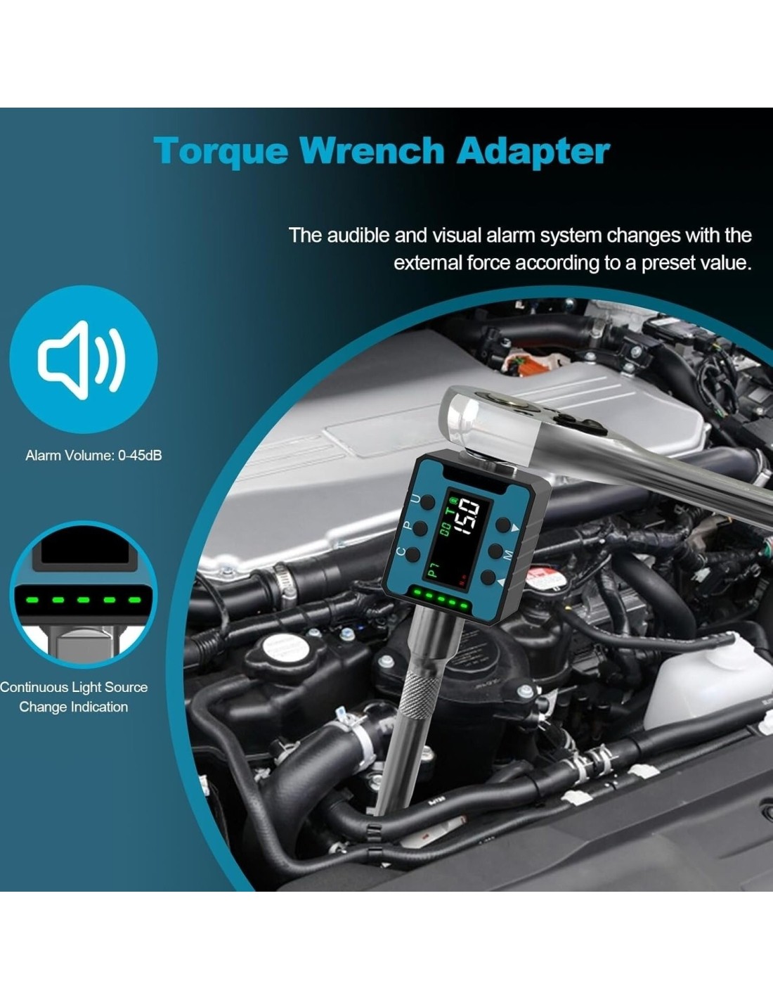The adapter has built-in sound and light alarm function and color screen display. When you set and apply a certain force, the adapter will issue a prompt before reaching the value. After reaching a specific value, the buzzer will sound/red light will be on to alarm. The torque adapter screen has a backlight and can be used in low light/at night, which can help you read better. Note: This product will automatically shut down if there is no operation within five minutes.