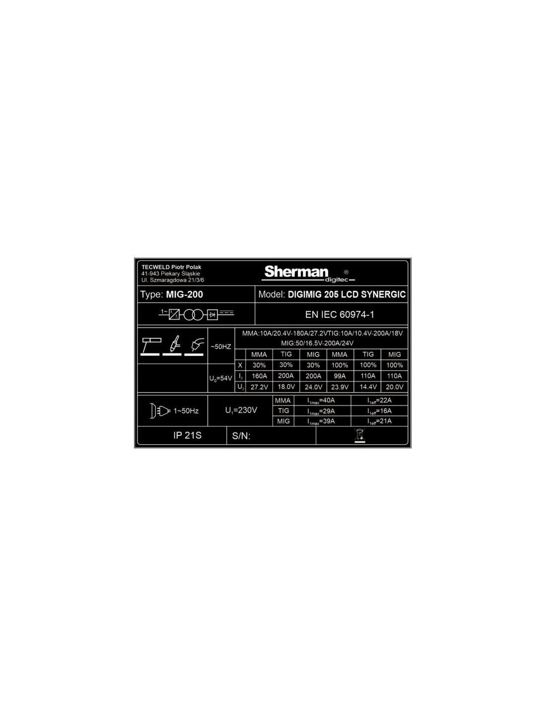 Inverter welder Sherman DIGIMIG 205 LCD SYNERGIC