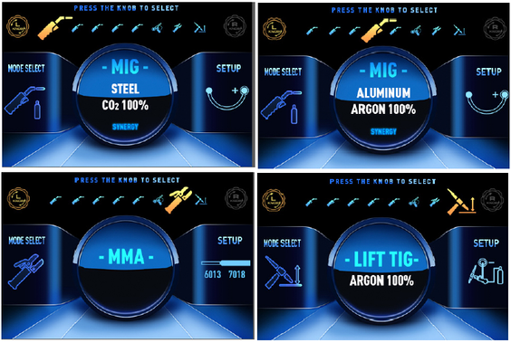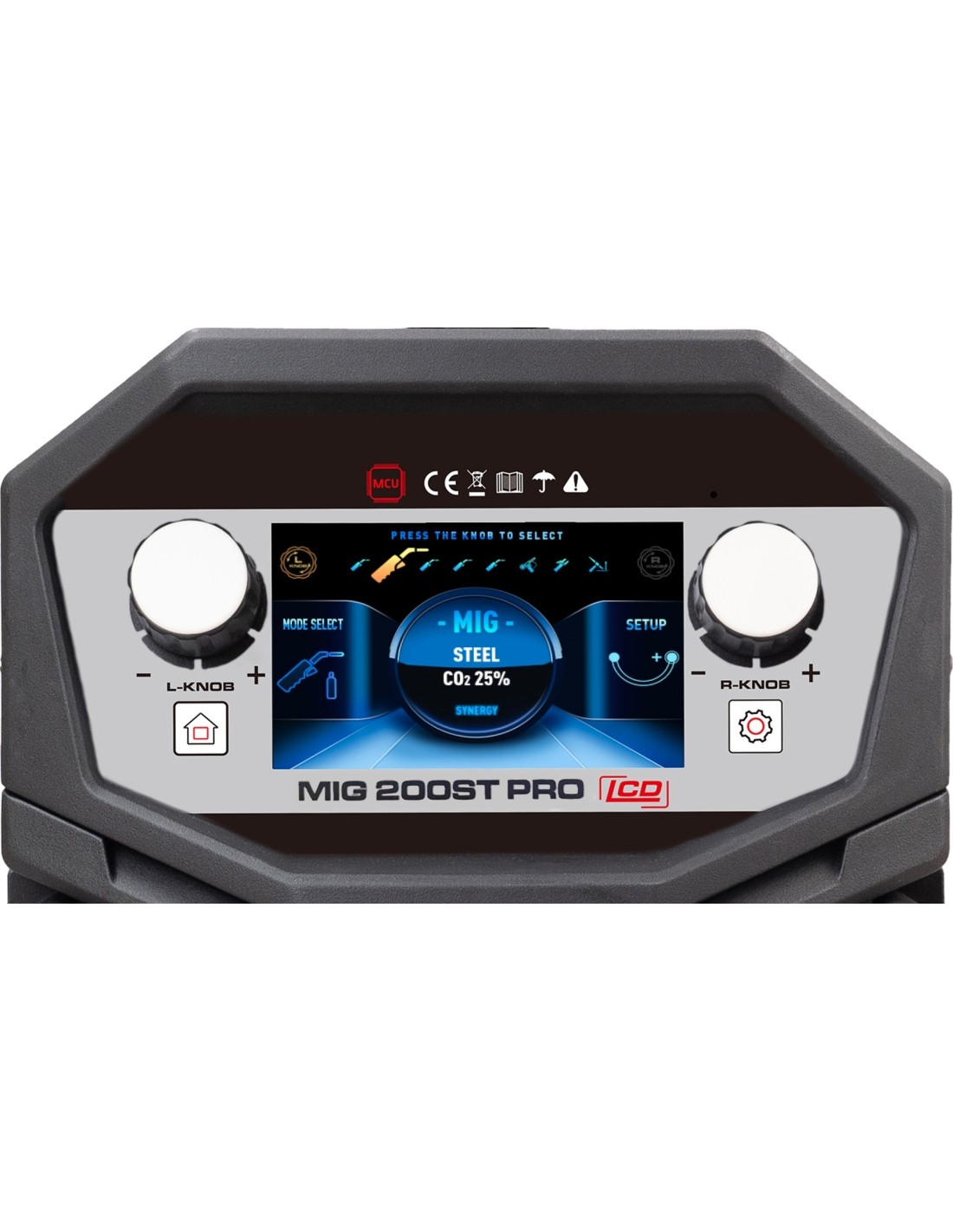 - Modernus LCD ekranas: aiškiai rodo srovę, įtampą, vielos padavimą ir parinktą režimą.