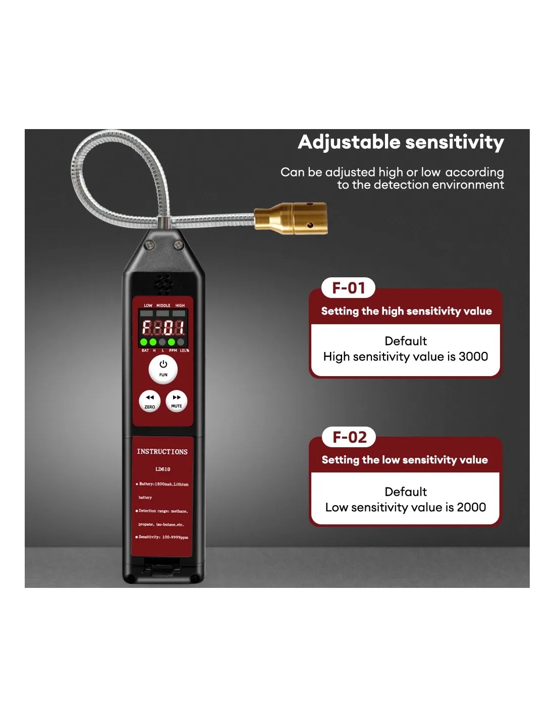 Reguliuojamas jautrumo lygis: šis dujų testeris, turintis didelio ir mažo jautrumo režimus, prisitaiko prie skirtingų aptikimo scenarijų. Numatytoji šio gaminio didelio jautrumo vertė yra 3000, mažo jautrumo vertė – 2000.