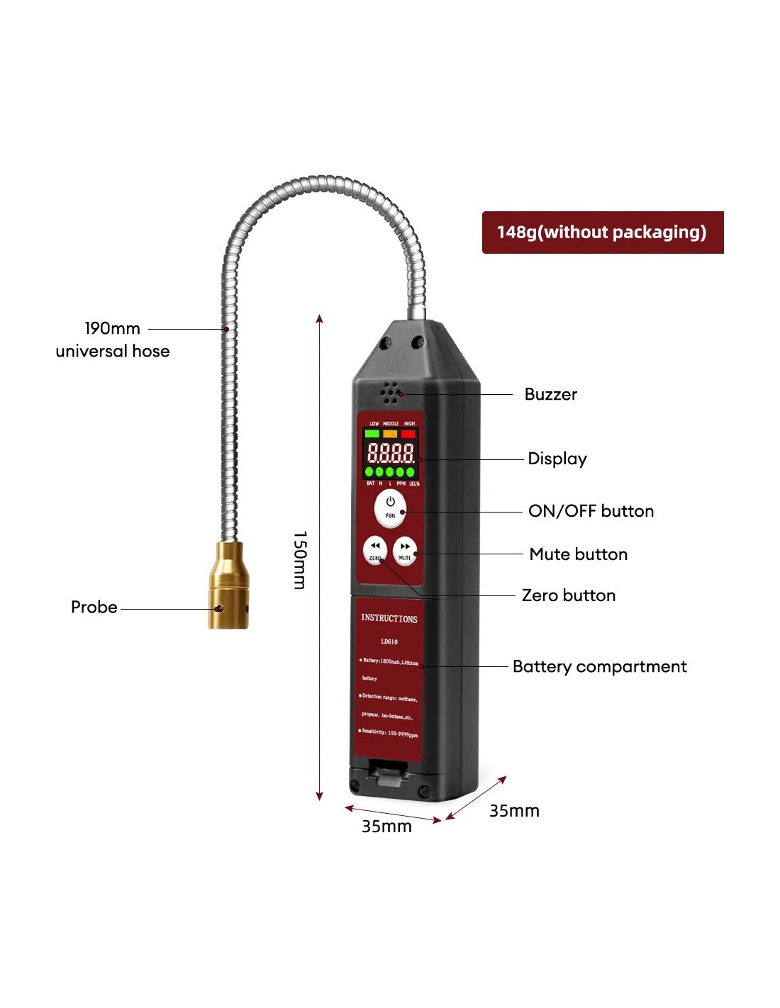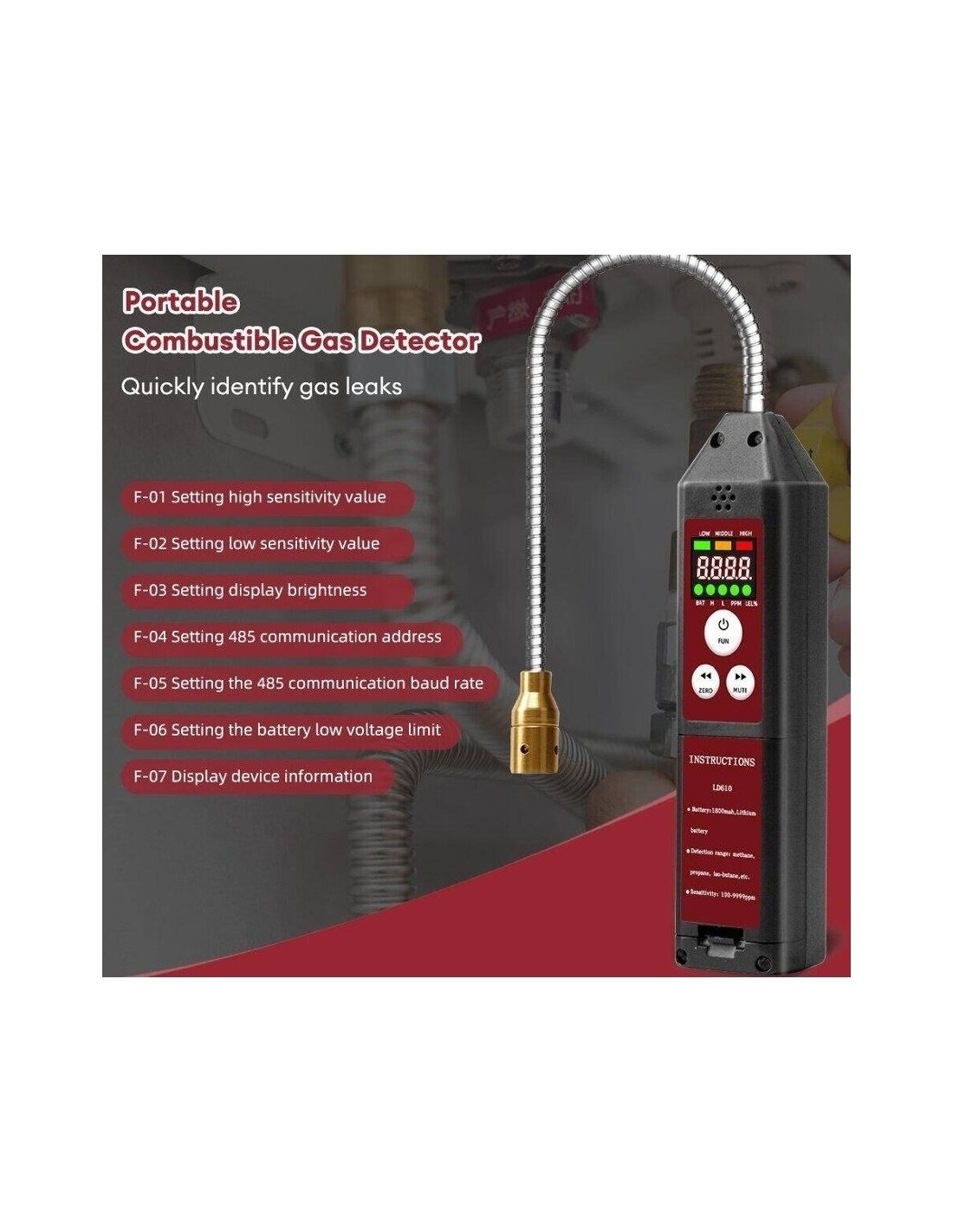 Dideliu jautrumu (100–9999 ppm) aptinka CH4, C3H8 ir C4H10 dujas. Turi reguliuojamą jautrumą, garsinį signalą, nutildymo režimą ir USB įkrovimą. 360° lankstus zondas leidžia lengvai aptikti nuotėkį sunkiai pasiekiamose vietose.