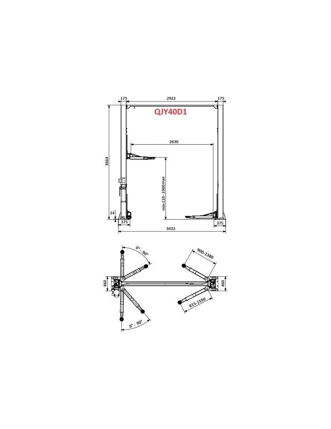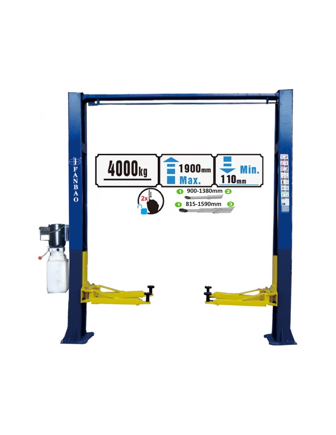 Hidraulinis dviejų kolonų keltuvas su mechaniniais saugumo fiksatoriais 4t 380V, (3 pakopų letenos)