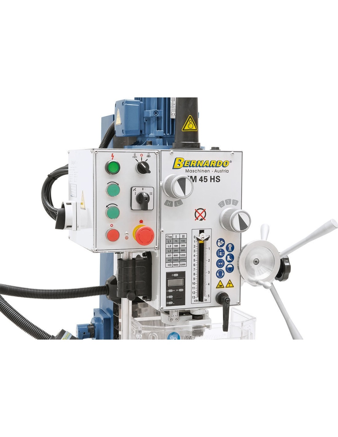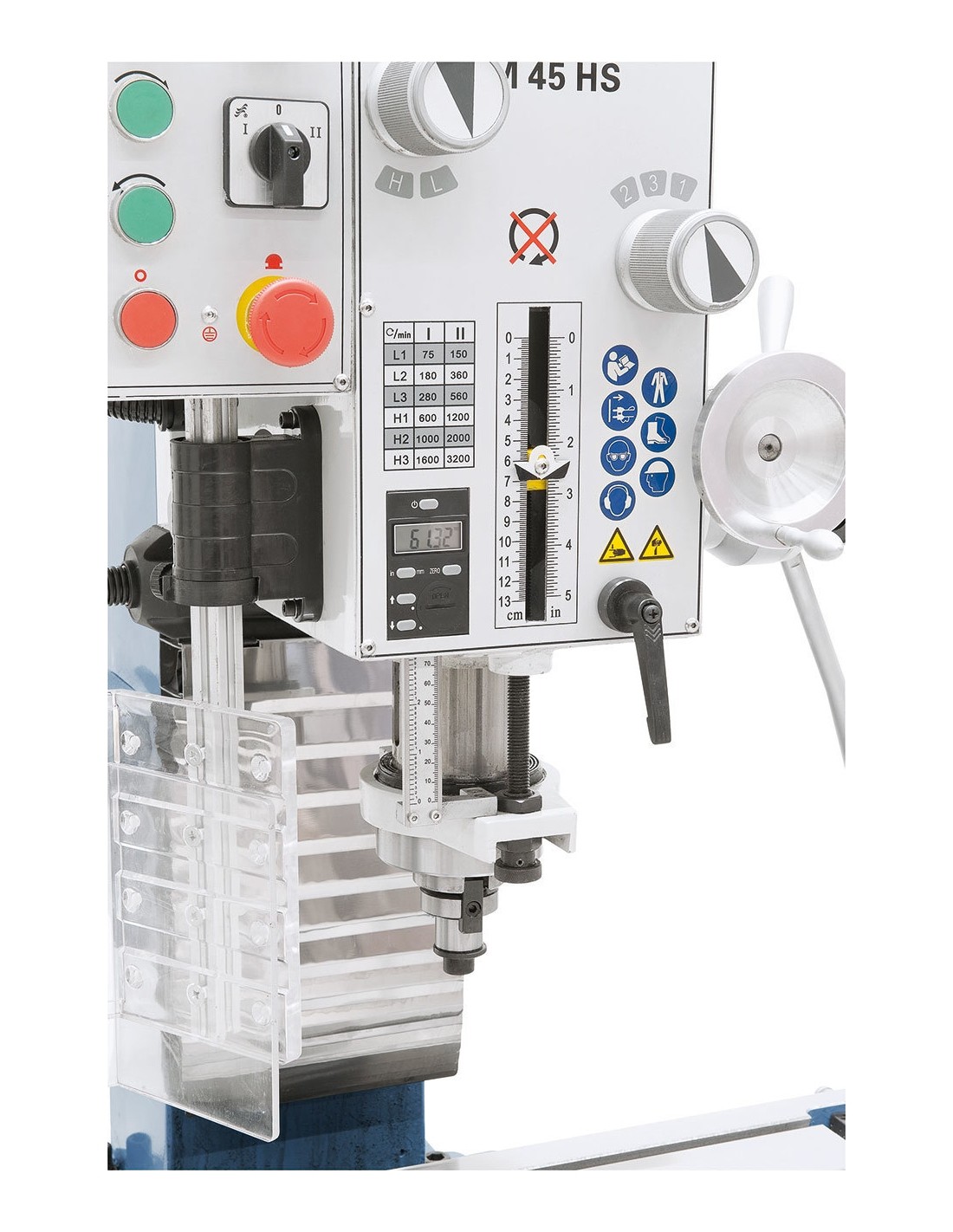 - Handle allows spindle feed, handwheel allows fine feed
