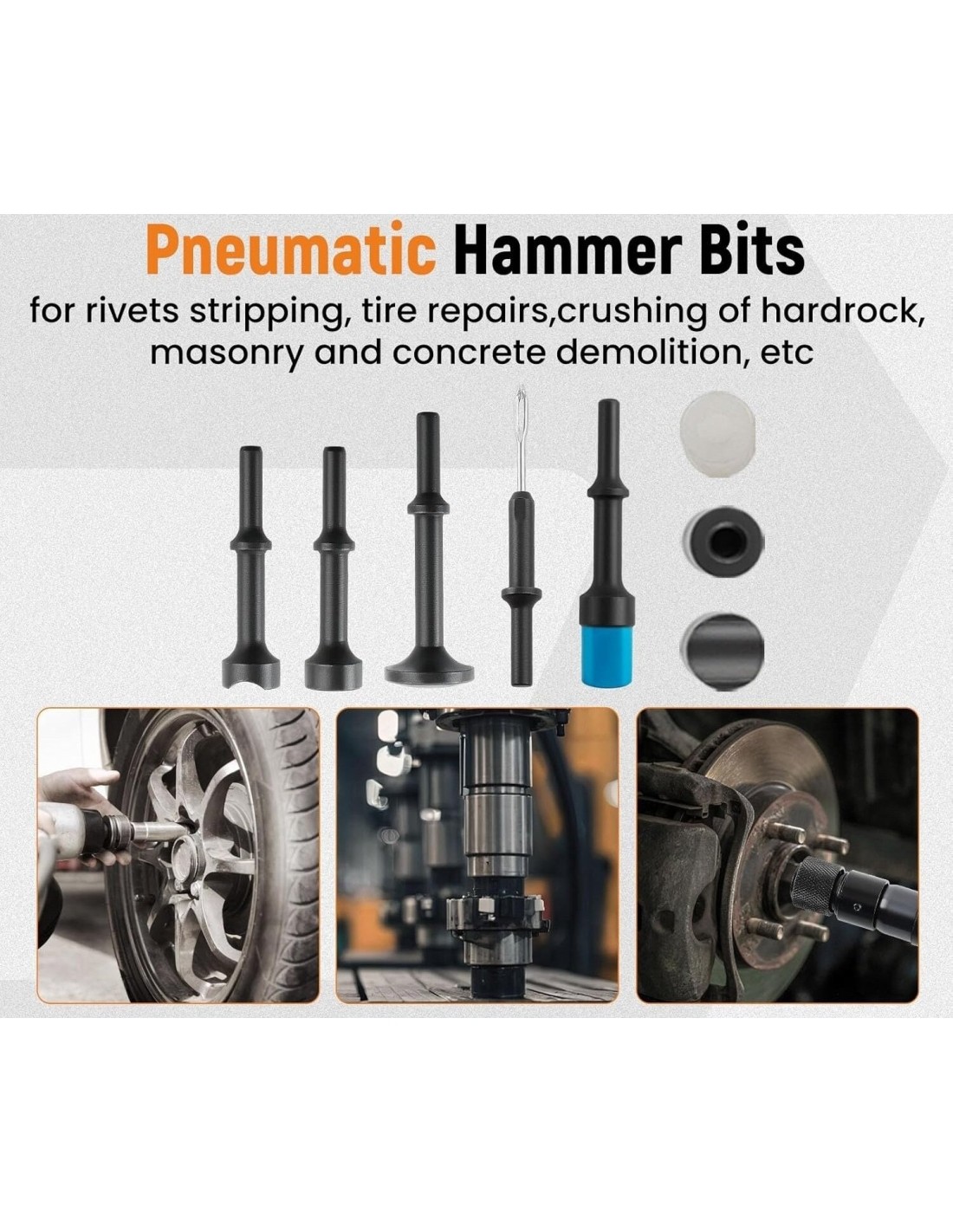 Traukių ir šarnyrų nuėmėjų rinkinys pneumatiniam plaktukui puikiai tinka automobilių skardos kalimui, ratų nukalimui, suvirinimo ar betono šlako valymui, aliuminio lydinių durų ir langų kniedymui, didelių/vidutinių/mažų liejinių šerpetojimui ir kt.