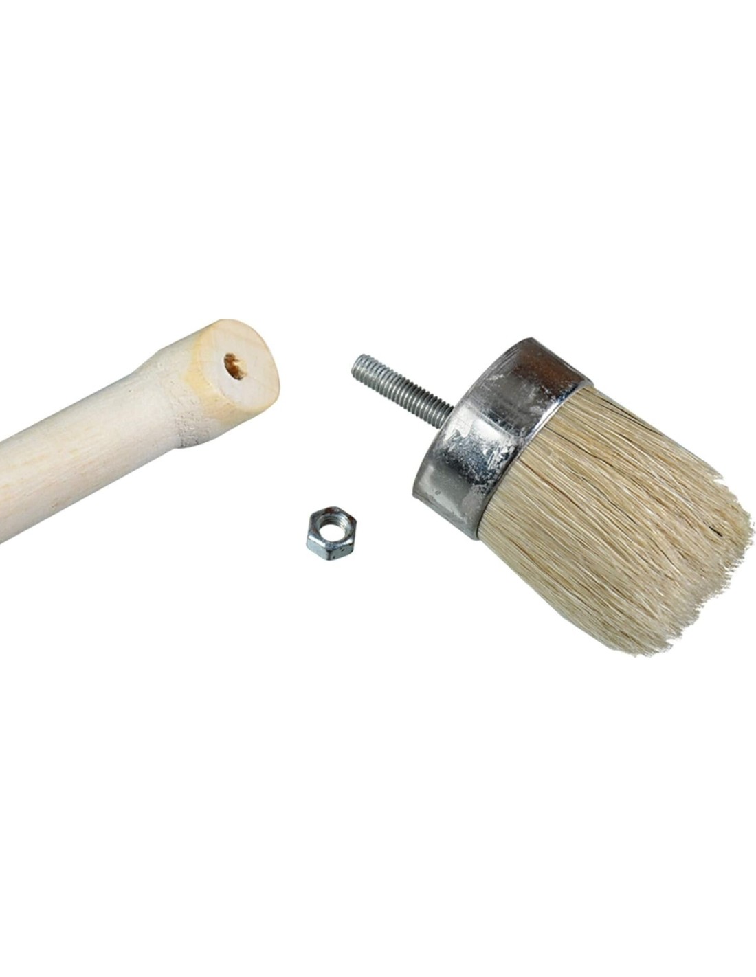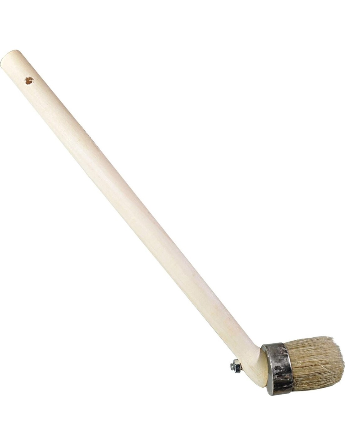 Kampinis šepetys yra su ilga medine rankena ir nuimama šepečio galvute