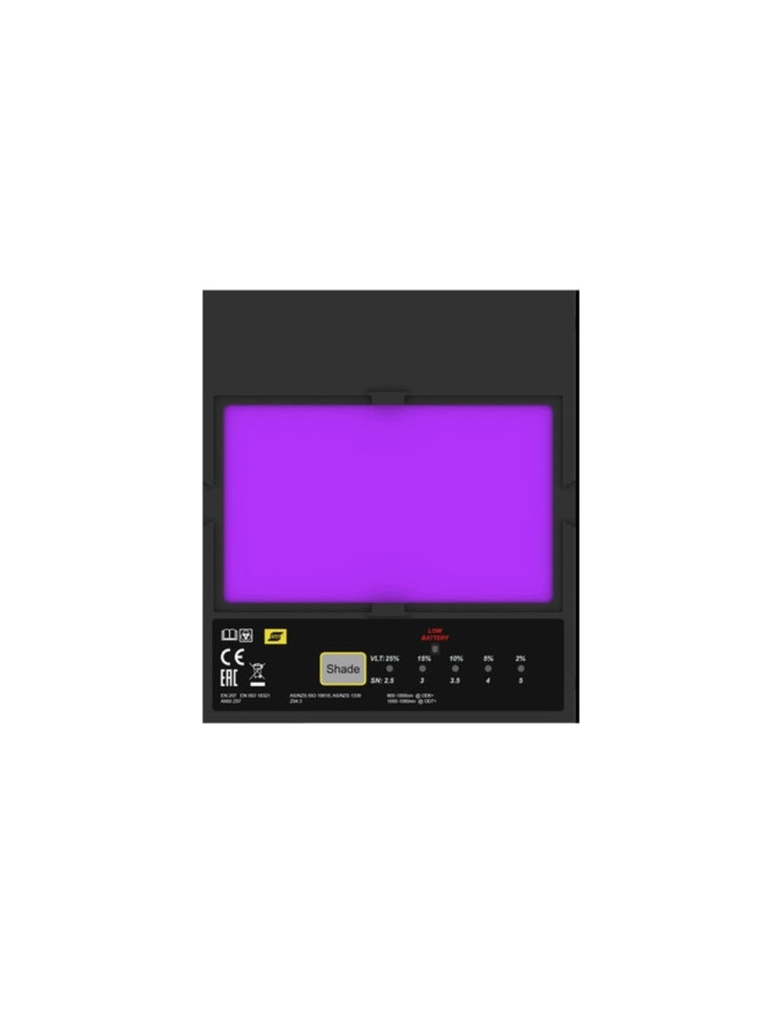 Skydelis turi penkis reguliuojamus tamsinimo lygius (2,5–5) bei didelį 100 × 60 mm matymo lauką, užtikrinantį puikų matomumą, darbo tikslumą ir akių komfortą net atliekant preciziškus suvirinimo darbus. Lengvas anglies pluošto priekinis korpusas suteikia tvirtumą ir sumažina nuovargį ilgai dirbant.