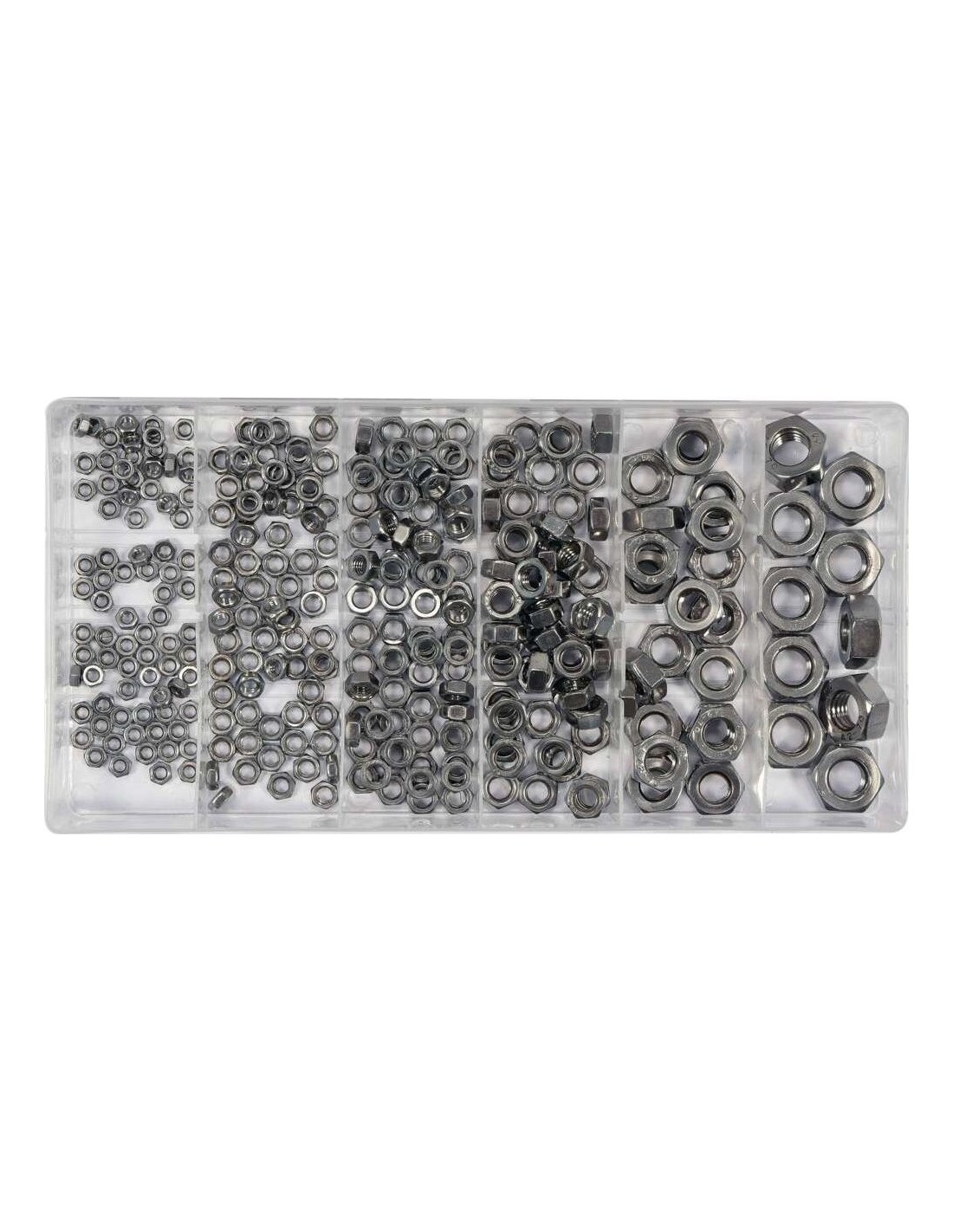 300 vnt. metrinių nerūdijančio plieno veržlių rinkinį sudaro dydžiai M3 – 80 vnt., M4 - 70 vnt., M5 - 70 vnt., M6 - 50 vnt., M8 - 20 vnt., M10 - 10 vnt.